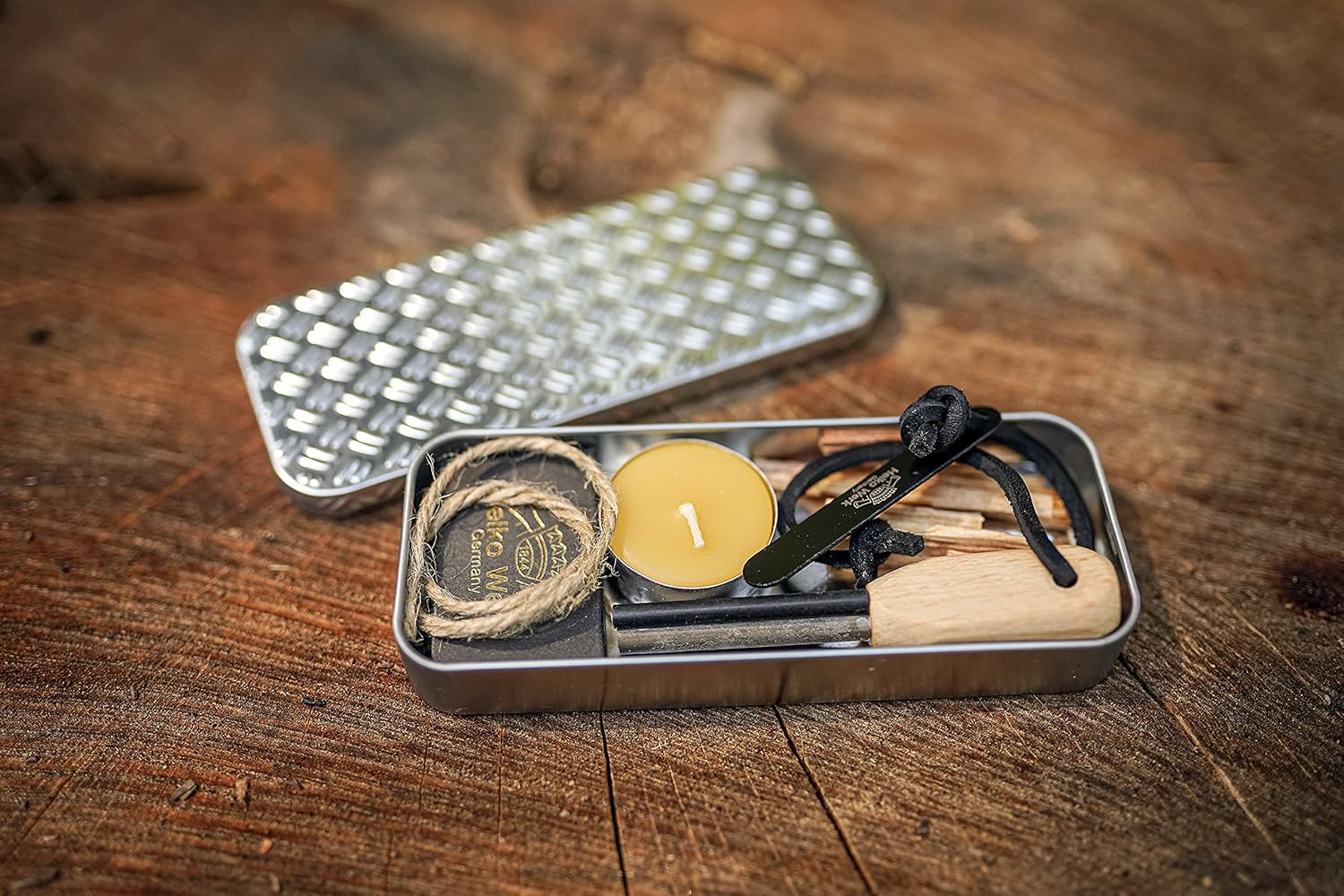 INCLUDES PORTABLE TRAVEL TIN: Stow all your fire tools in this convenient lightweight aluminum tin. Portable yet spacious enough to configure and organize your own unique custom collection of fire starting material.