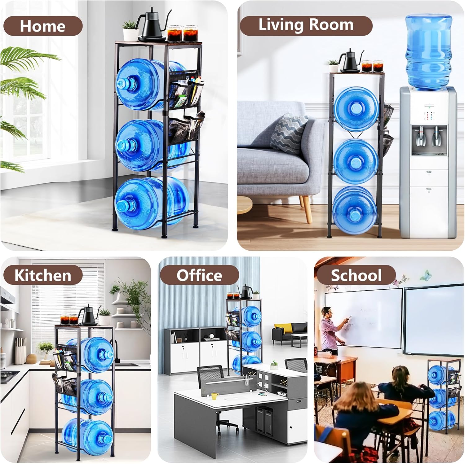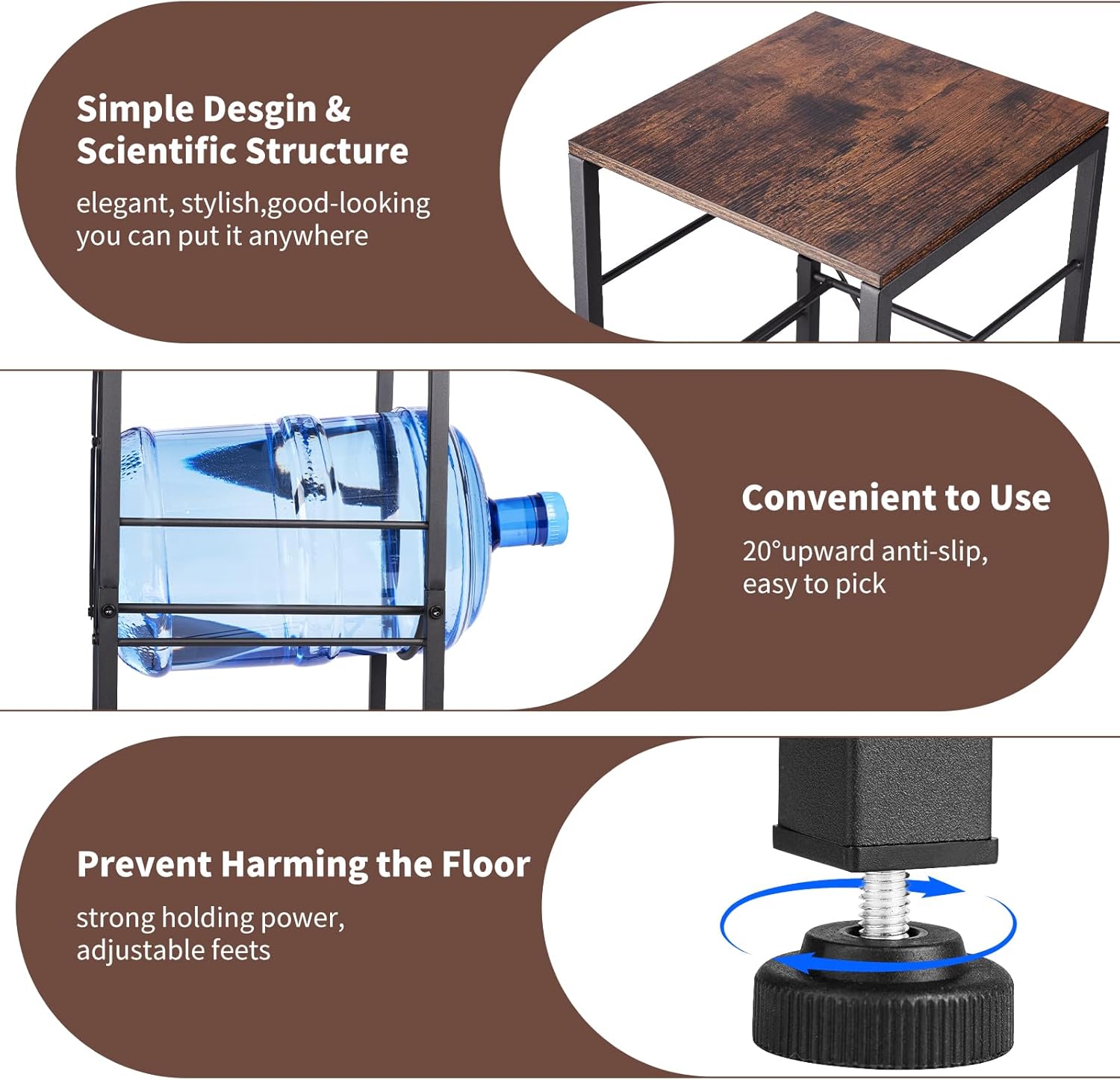 Secure and stable storage with adjustable feet and reinforced fixation.The 5-gallon water bottle storage rack features four adjustable feet that can be customized to fit uneven floors.Protecting your floors from scratches and ensuring a stable base.