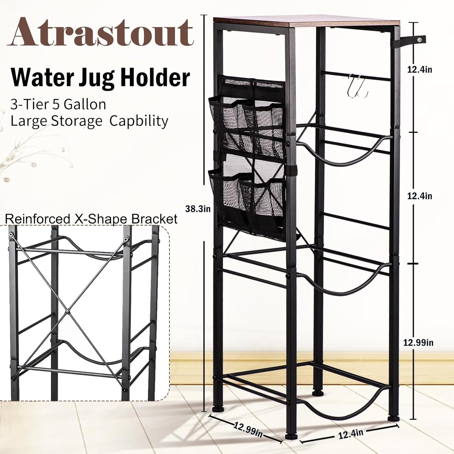 Space-Saving Water Jug Storage Organizer Design with 3-Tier Compact Dimension. Atrastout 5 gallon water bottle rack with wooden top shelf, 12.99” x 12.4” x 38.3”, efficiently saving space, a perfect water jug holder for storing up to three 5-gallon bottles for home&office.