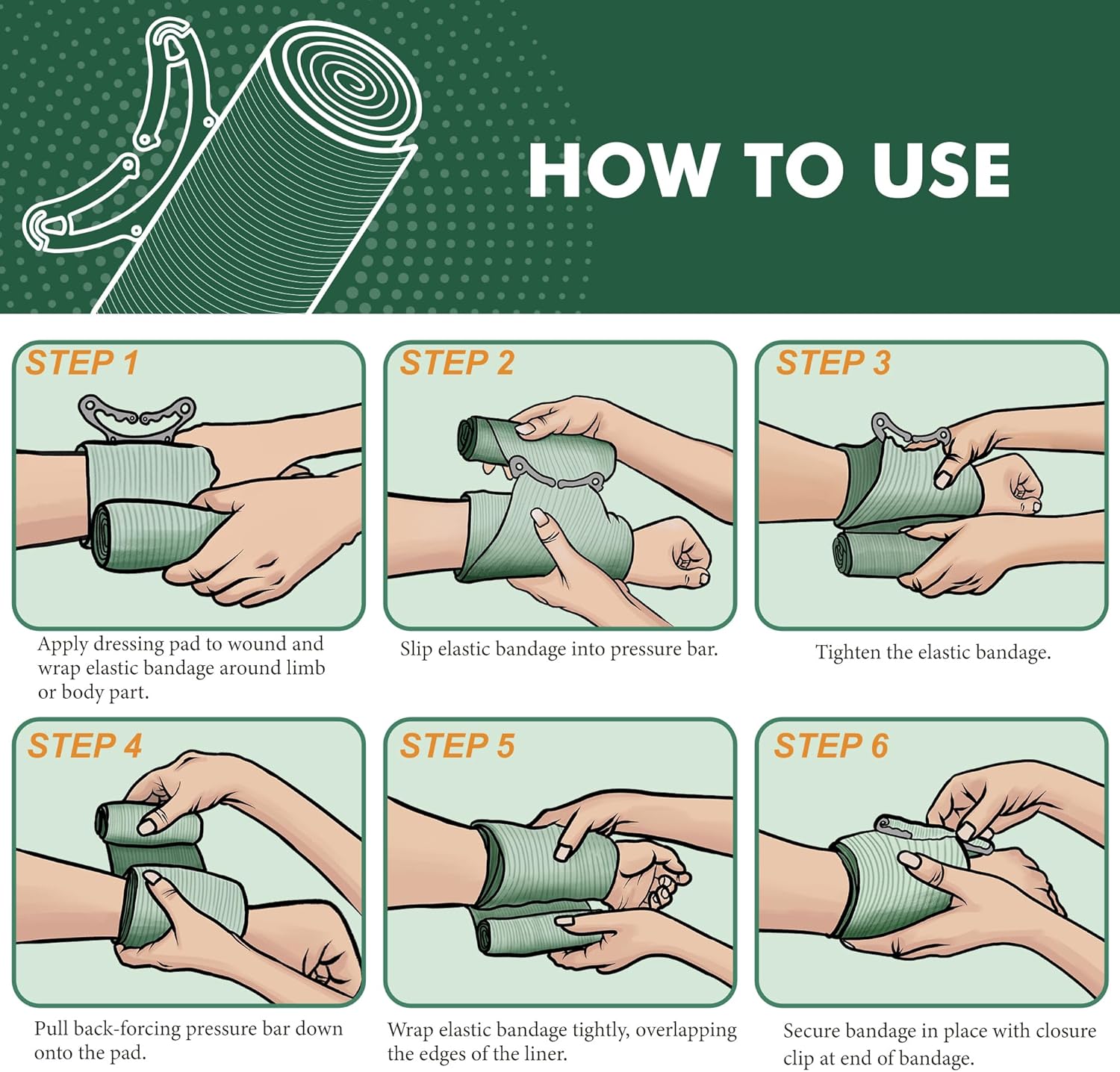 ALL-IN-ONE MULTIFUNCTIONAL DESIGN – Combines an elastic assist bandage, non-adhesive pad, Pressure Applicator, and closure in one unit. Simplifies the first aid process and enables quick and effective response to a wide range of wounds.
