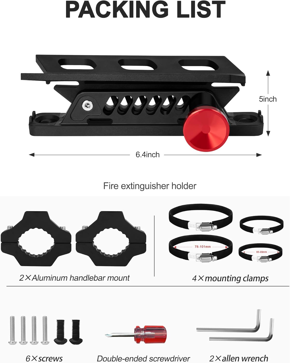【Custom fire extinguisher mount for ATV】Comes with a sturdy aluminum alloy bracket, designed to fit handlebars ranging from 7/8″ to 9/8″. It’s compatible with a wide range of ATV including Yamaha, Polaris, Honda, Can-Am, Kawasaki, Suzuki, KTM, Arctic Cat, and Suzuki again. Plus, it can also double as a motorcycle fire extinguisher mount,stay safe