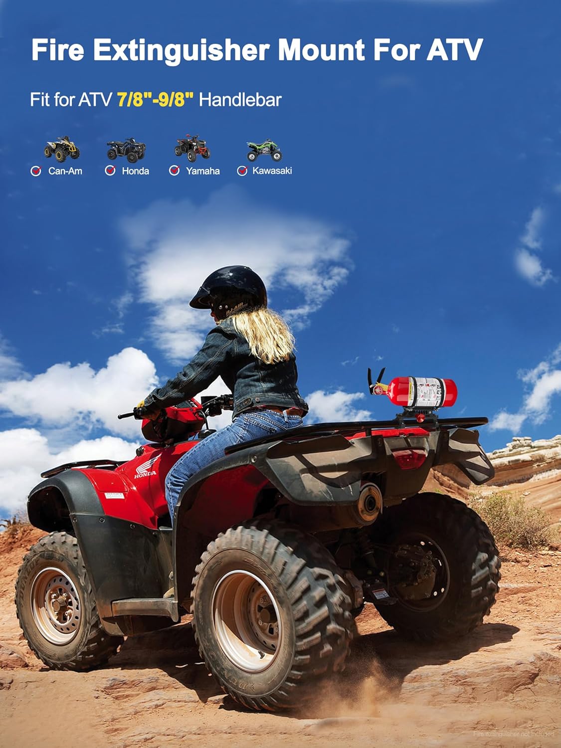 ATV fire extinguisher holder fit for 7/8″-9/8″ handlebars, compatible with a wide range of ATV including Yamaha, Polaris, Honda, Can-Am, Kawasaki, Suzuki, KTM, Arctic Cat, and Suzuki again. Plus, it can also double as a motorcycle fire extinguisher mount, boat fire extinguisher mount holder