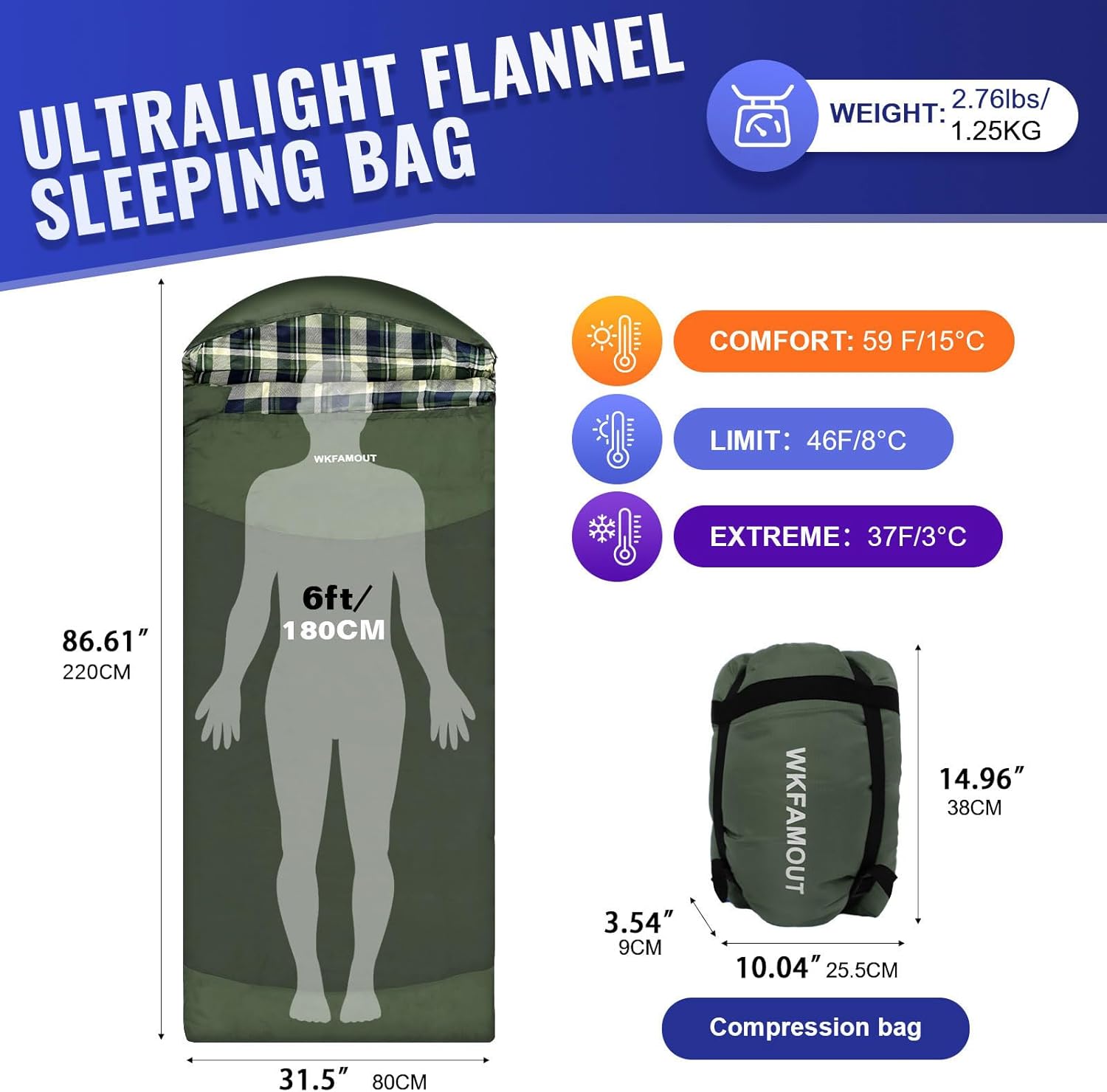 Lightweight and portable: WKFAMOUT sleeping bag measures 86.61*31.5 inches and weighs 2.76 pounds. Ultra-lightweight backpacker sleeping bags are made of lightweight materials to ensure an extremely light overall weight. This makes it easier for backpackers to carry a lighter load when hiking, camping or climbing long distances