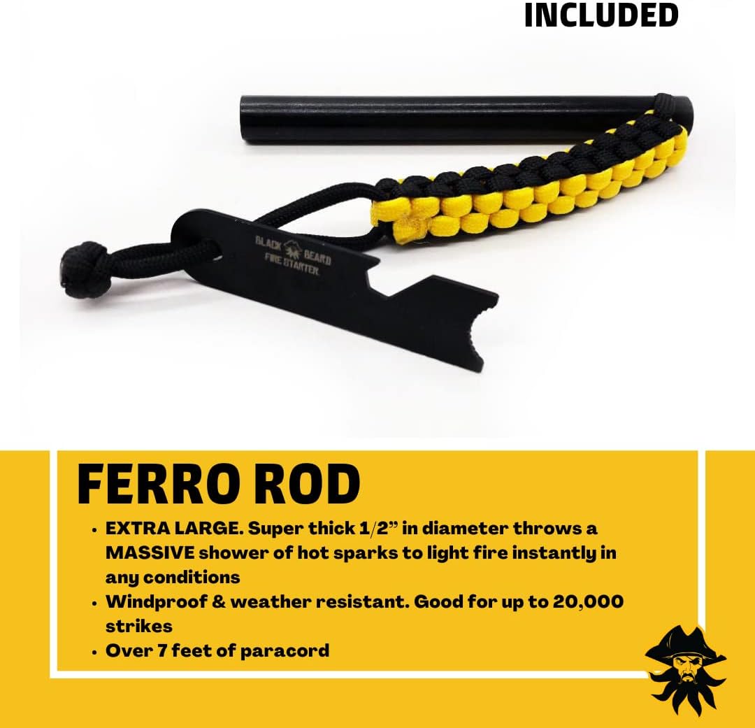 BLACK BEARD FERRO ROD – Rain, wind or shine, the fire starter sparks in all weather, at any altitude throwing massive shower of 5000-degree sparks to light fires instantly and best paired with the Black Beard Fire Starter Rope (Included)