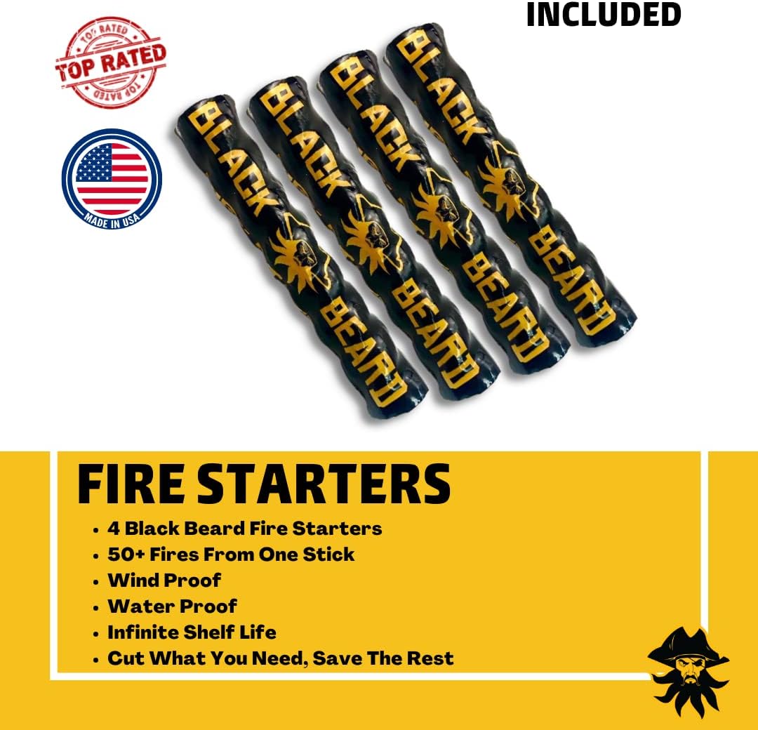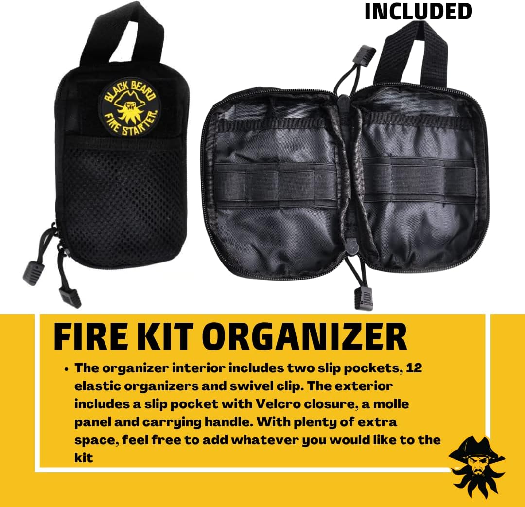 INCLUDES – 4 Black Beard Fire Starters, 1 Ferro Rod, 1 Plasma Arc Lighter, 1 Fire Kit Organizer, 1 Black Beard Velcro Patch