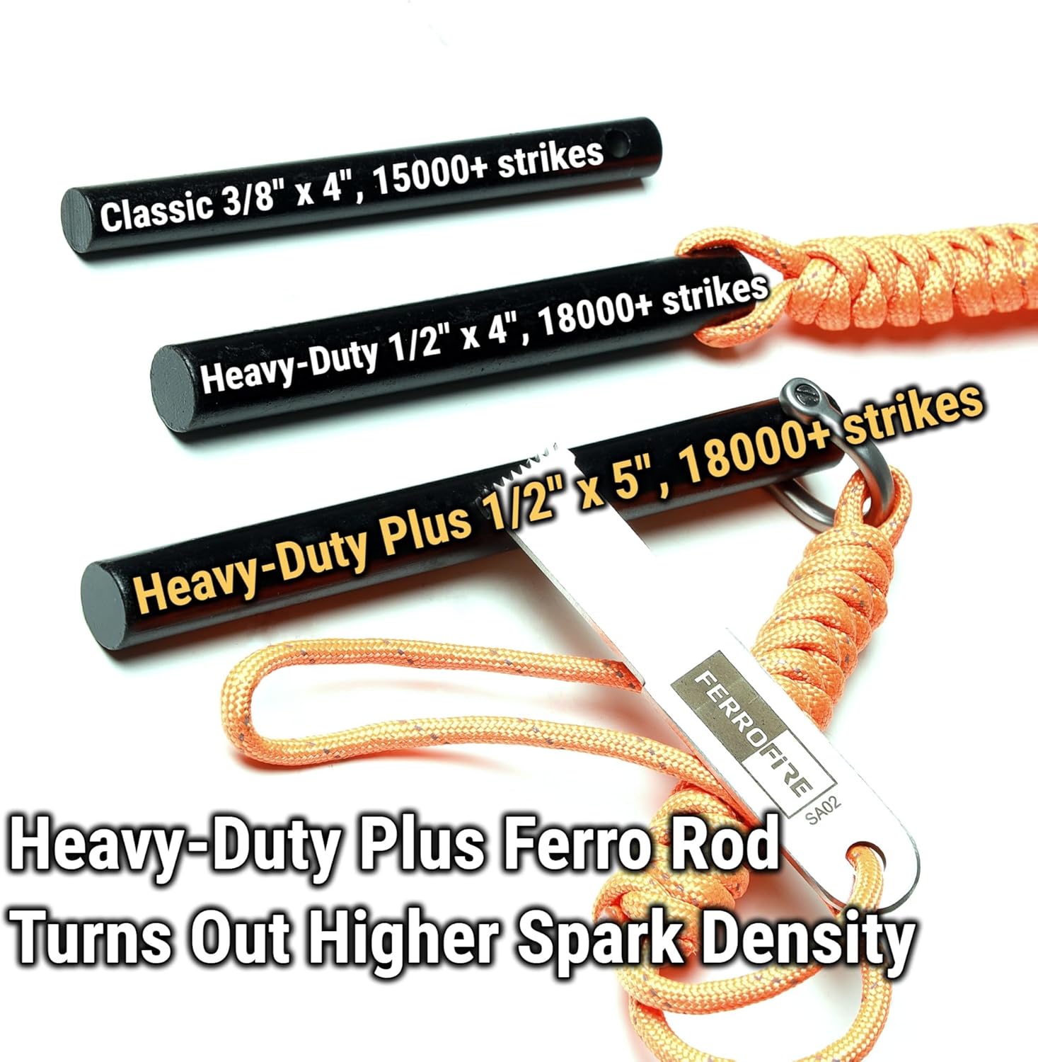 HIGHER SPARKS DENSITY WITH TRUE 18,000+ STRIKES – net weight is only 145g/5.1oz, the heavy-duty plus ferro rod with 18,000 strikes generates much more flying sparks that comes from longer striiking distance to easily ignite a camping fire for survial use.