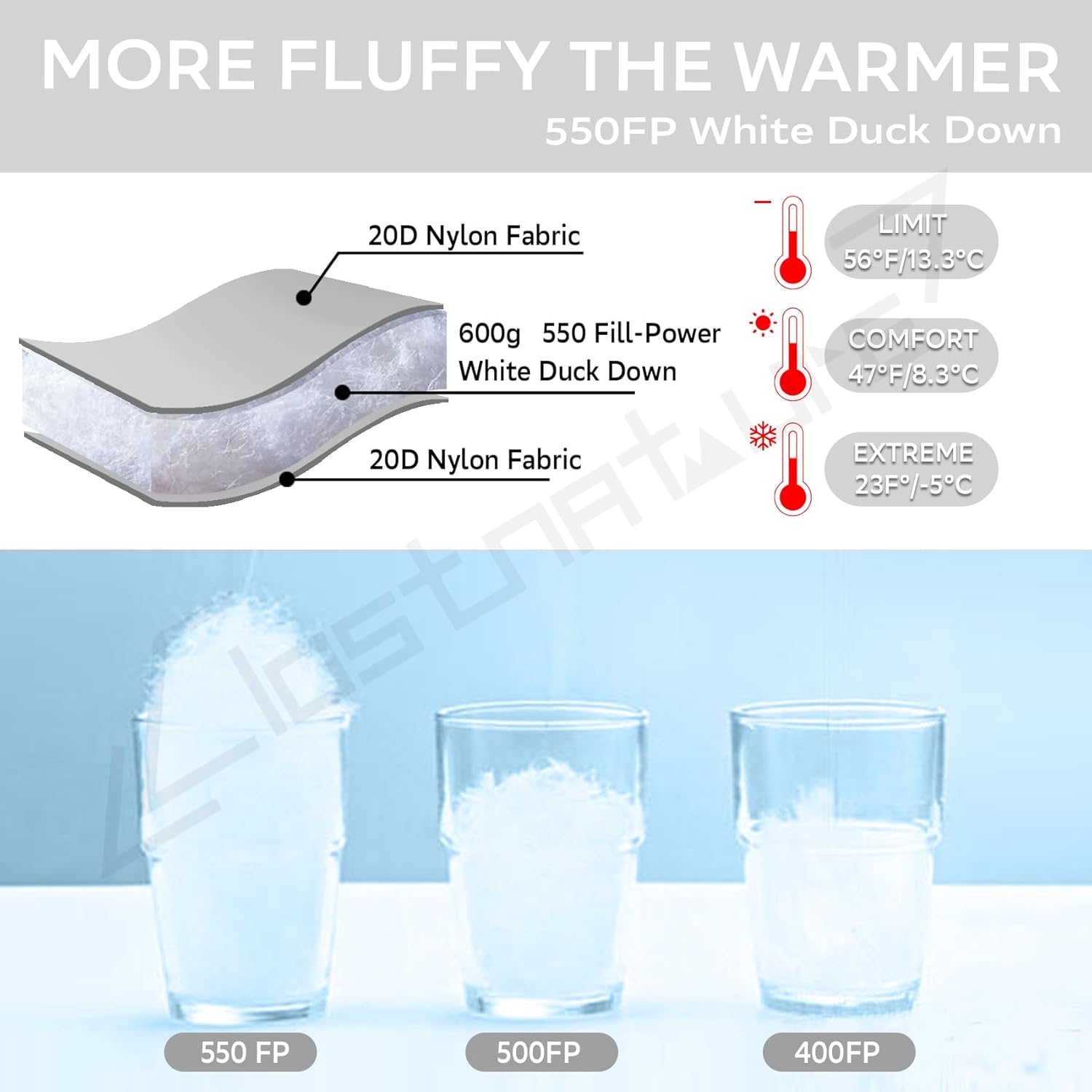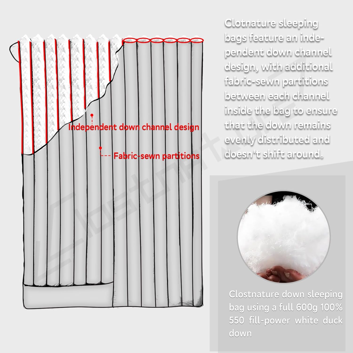 PREMIUM DOWN INSULATION: Clostnature down sleeping bag using a full 600g 100% 550 fill-power white duck down. This pure, odorless down filling ensures excellent insulation without any impurities, providing a comfortable experience akin to floating on clouds. Before using an ultralight sleeping bag, you can gently tap it, which will make the inside more fluffy and provide you with a better experience. Recommended use temperature: 23F/(-5°C)-56F(13.3°C), comfortable temperature is 47F(8.3°C)