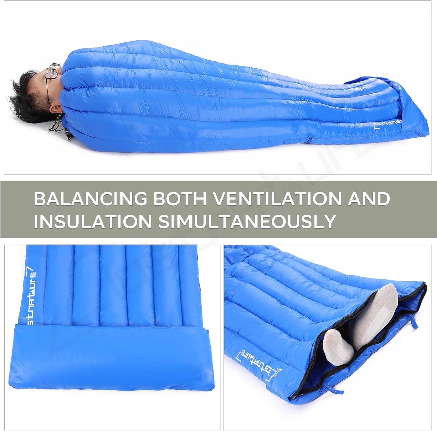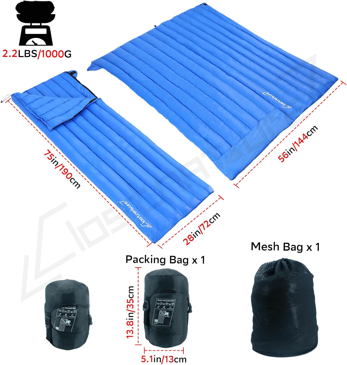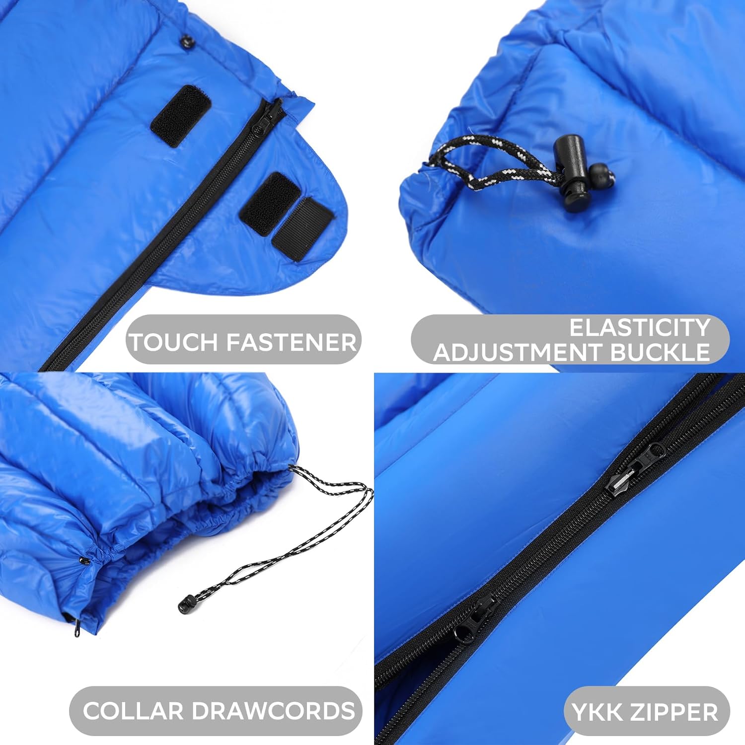 ROBUST AND WATERPROOF: The down sleeping bags are crafted with 20D insulated nylon fabric, designed for enduringness and softness. Additionally, we employ advanced DWR waterproof coating for enhanced protection. It can provide a cozy sleeping environment while withstanding the demands of extreme outdoor weather conditions, ensuring it withstands the rigors of outdoor use for years to come. NOTE: Despite our various waterproof designs, down-filled products are not recommended for machine washing