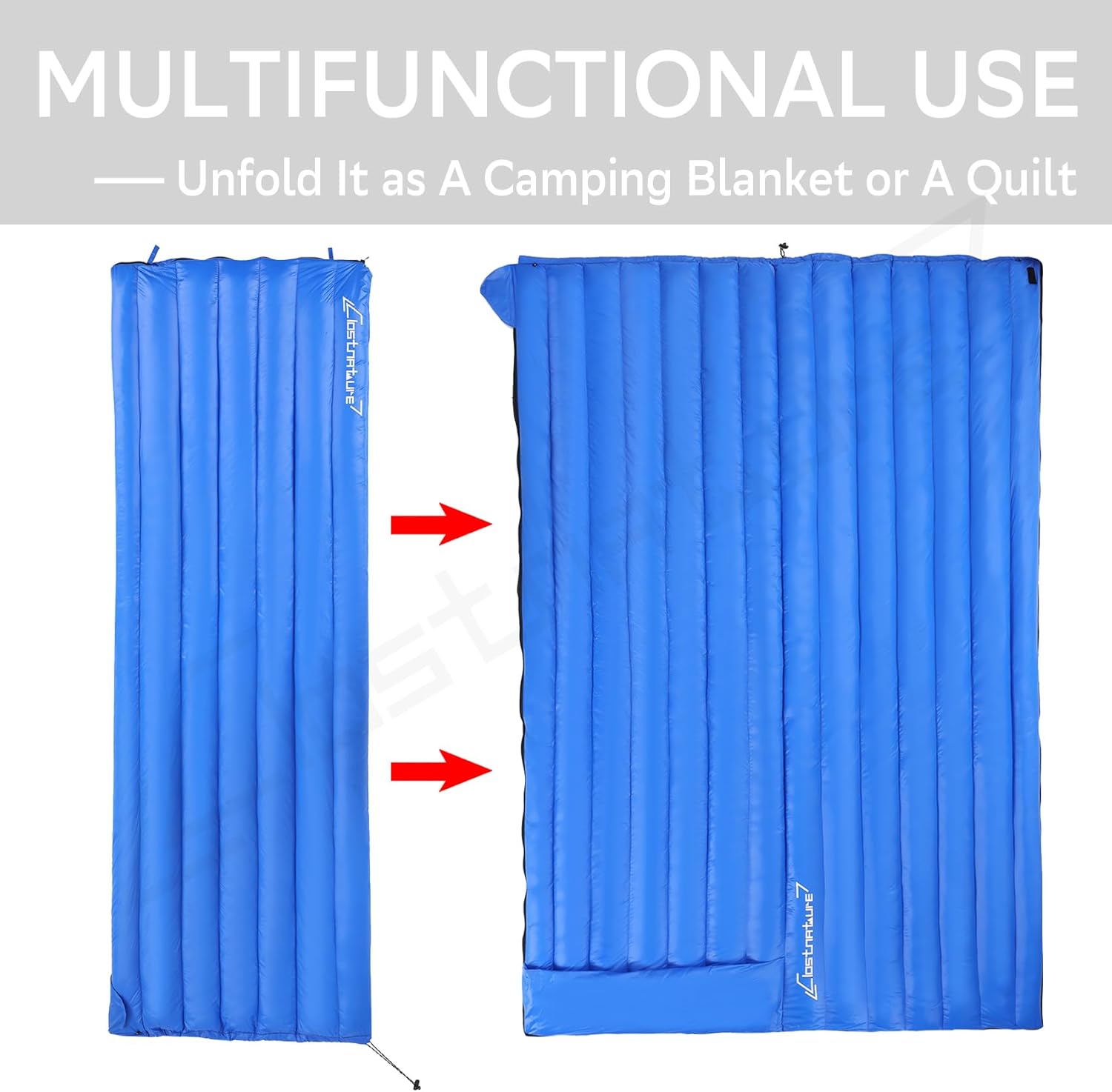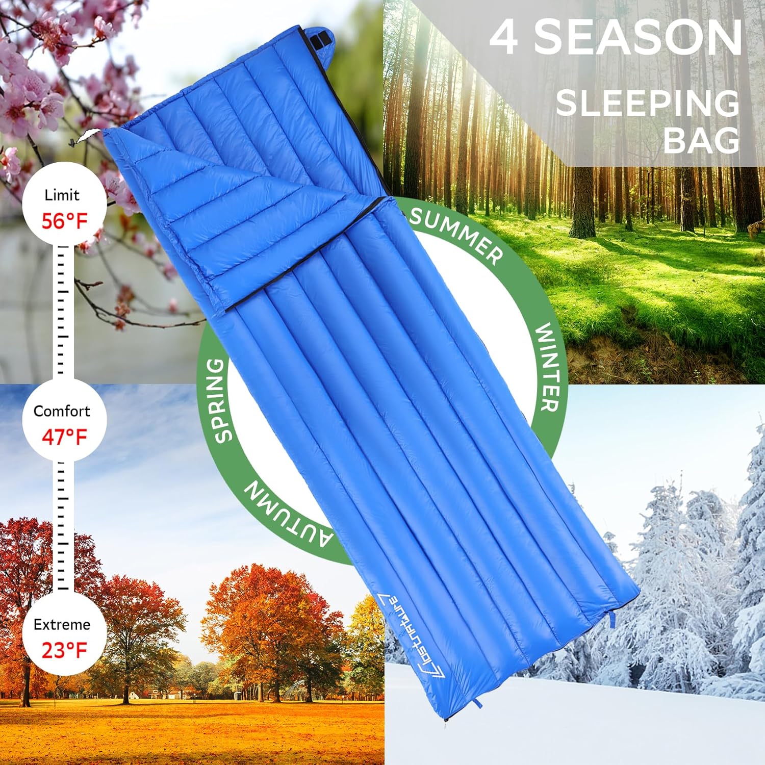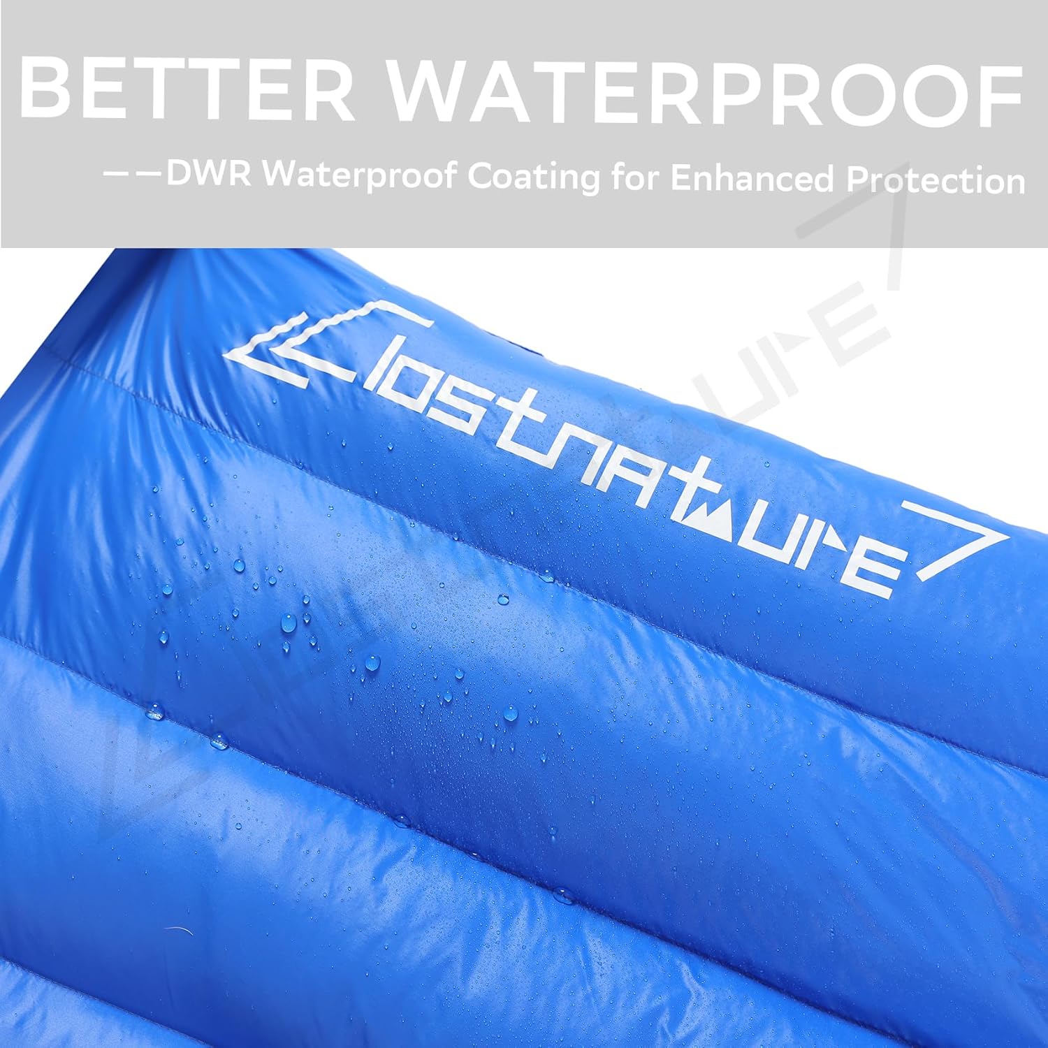 ROBUST AND WATERPROOF: The down sleeping bags are crafted with 20D insulated nylon fabric, designed for enduringness and softness. Additionally, we employ advanced DWR waterproof coating for enhanced protection. It can provide a cozy sleeping environment while withstanding the demands of extreme outdoor weather conditions, ensuring it withstands the rigors of outdoor use for years to come. NOTE: Despite our various waterproof designs, down-filled products are not recommended for machine washing