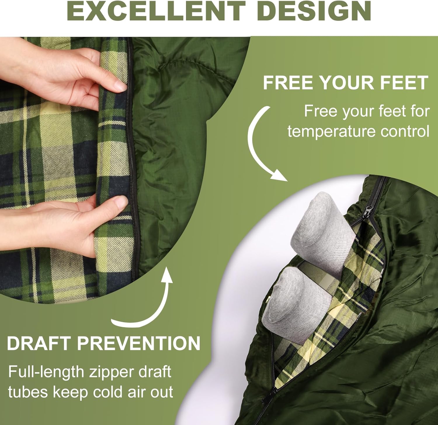 FLANNEL SO SOFT, YOU’LL FORGET YOU’RE CAMPING! Who says camping can’t be cozy? With 100% flannel lining, this sleeping bag feels like a hug from your favorite blanket. It’s so soft, you might just forget you’re under the stars and not in your bed at home.