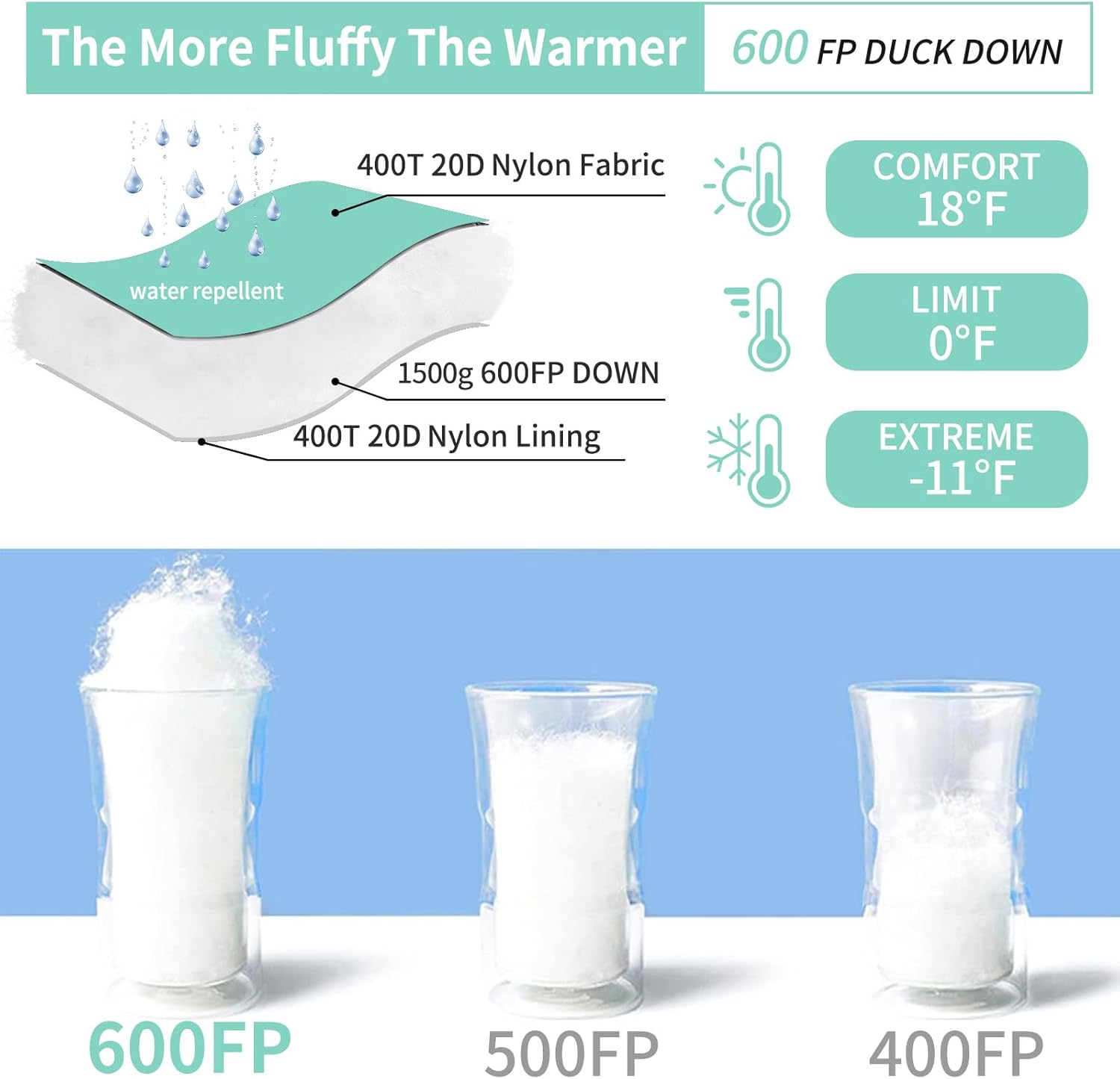 【 𝐊𝐄𝐄𝐏 𝐖𝐀𝐑𝐌 】 The ultralight sleeping bag is filled with 3.3lb fluffy and soft natural duck down, 600+Fill Power, it has excellent expansion and give you light and soft feeling, keeping you in warm all night. Comfortable Temperature: 0°F-18°F, Limited Temperature: -11°F. (Note: The product is extremely compressed when stored, it is recommended to ventilate for 3-4 hours after opening.)