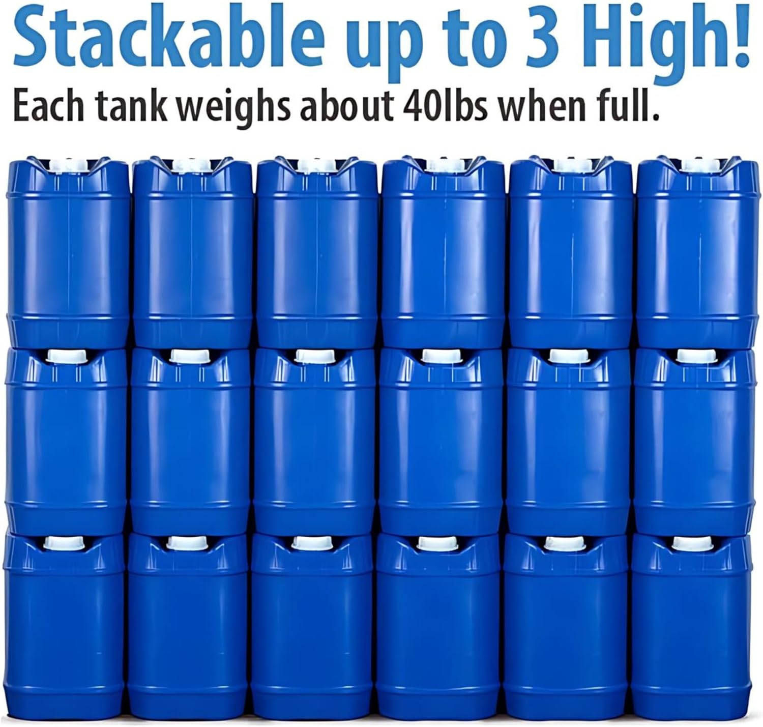 High-quality free HDPE Plastic, each container measures 15″H x 10″ W x 12″D5-gallon tanks Stackable up to 3 High, each tank weighs about 40lbs when fullWide opening for easy filling, cap with ¾” threaded opening, and vent cap for easy pouring (some prep required for use) any hose for use. Make sure to use a food-grade hose if used for drinking water!