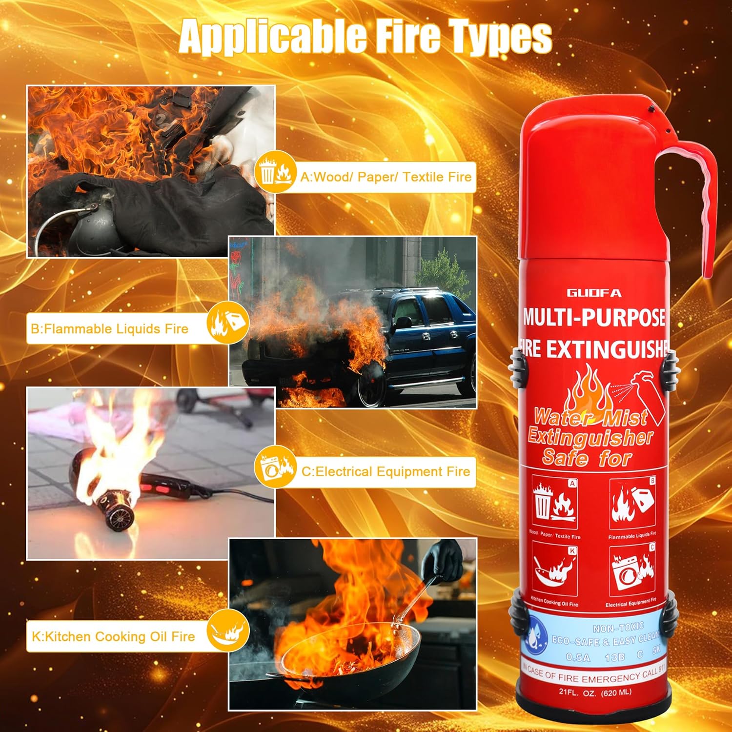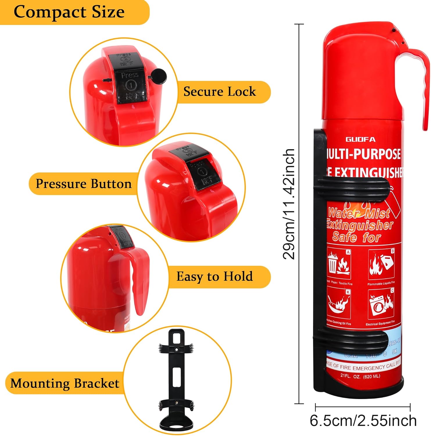 Compact and Portable: This kitchen fire extinguisher is 11.4 x 2.5 inches and 620ml, making it easy to store in your car, boat, garage, campsite or kitchen. The fire extinguisher with mount can be hung on the wall to keep it within your reach for quick use in fire emergencies.