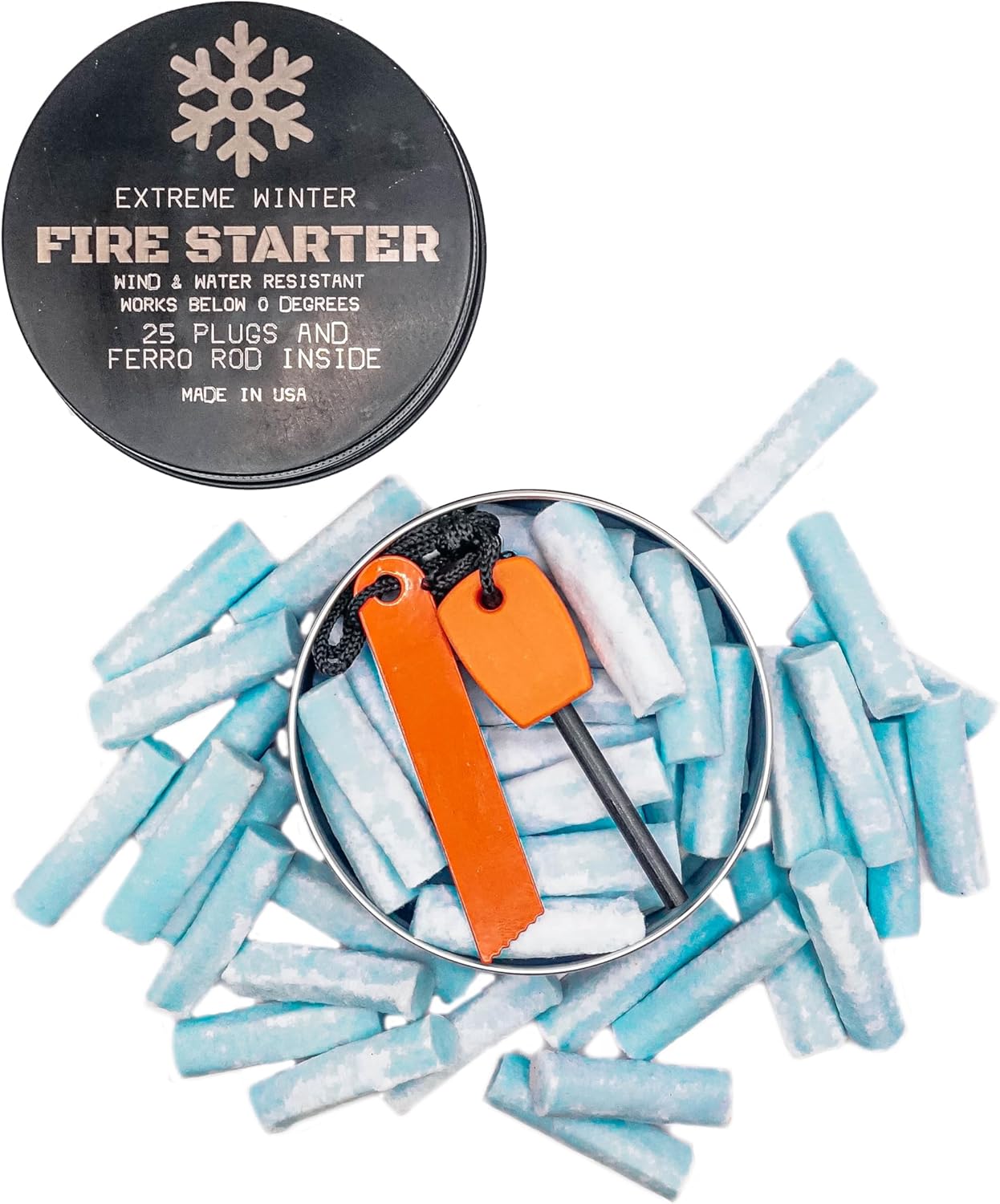 💪 COMPLETE FIRE STARTER KIT IN A CAN: Includes 25 water- and wind-resistant fire starter plugs in a durable aluminum can, along with a ferro rod, providing everything you need to start a fire even in the harshest winter conditions. – MADE IN THE USA