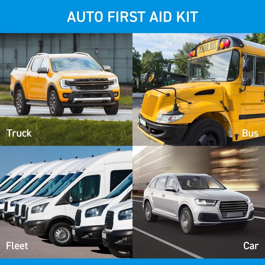 The Bright Care Auto Doc First Aid Kit is designed for cars, SUVs, trucks, and other vehicles.