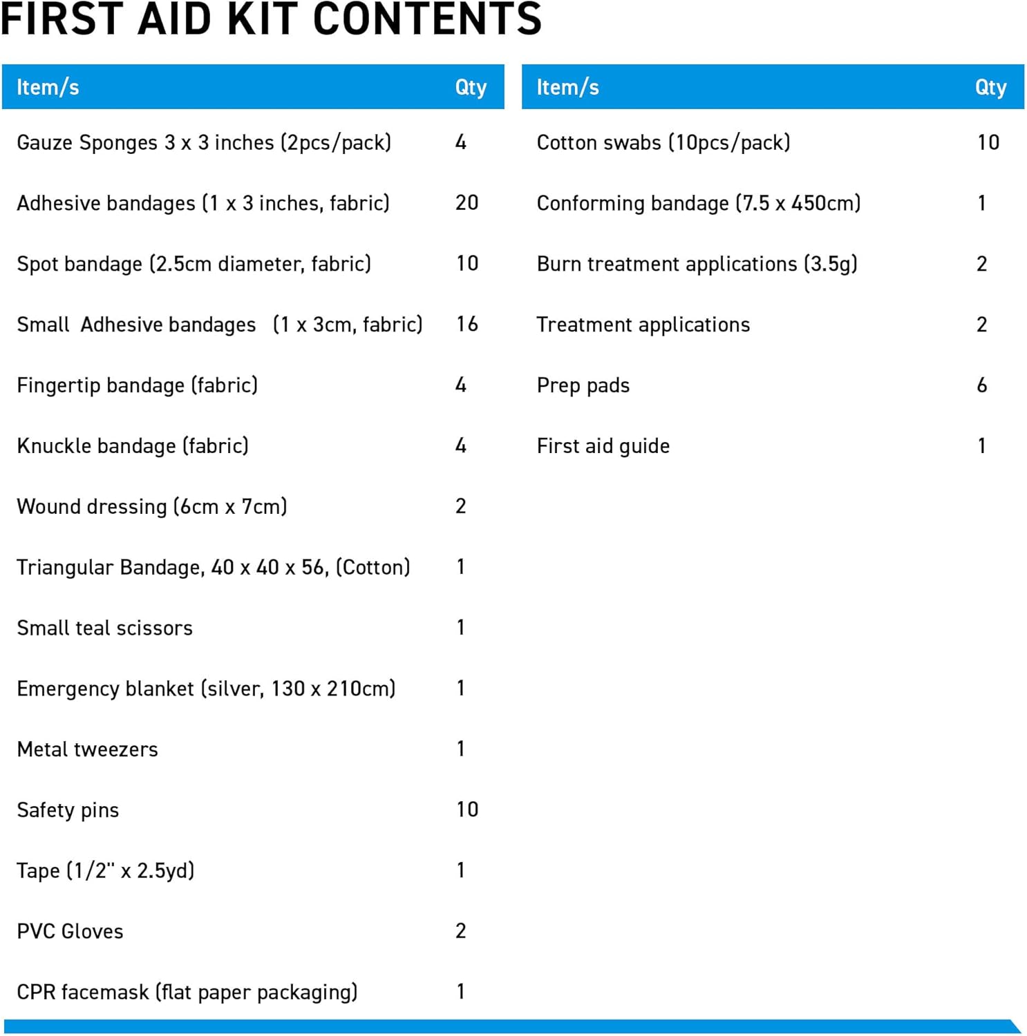 Gauze Sponges 3 x 3 inches (2pcs/pack) – 4 pieces, Adhesive bandages (1 x 3 inches, fabric) – 20 pieces, Spot bandage (2.5cm diameter, fabric) – 10 pieces, Small bandage (1 x 3cm, fabric) – 16 pieces, Fingertip bandage (fabric) – 4 pieces, Knuckle bandage (fabric) – 4 pieces, Wound dressing (6cm x 7cm) – 2 pieces, Triangular Bandage, 40x40x56, (Cotton) – 1 piece, Small teal scissors – 1 piece, Emergency blanket (silver, 130 x 210cm) – 1 piece, Metal tweezers – 1 piece, Safety pins – 10 pieces, Medical tape (1/2” × 2.5yd) – 1 piece, First aid gloves (2pcs/pack) – 2 pieces, CPR face shield – 1 piece, Cotton swabs (10pcs/pack) – 10 pieces, Conforming bandage (7.5 x 450cm) – 1 piece, Treatment packs (3.5g) – 2 pieces, treatment applications – 2 pieces, Prep pad – 6 pieces, First aid guide – 1 piece
