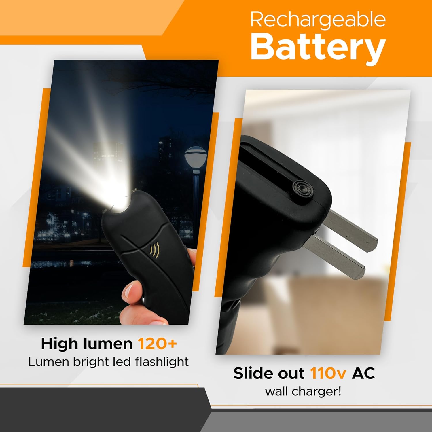 Rechargeable Convenience: Recharge your stun gun via a direct-to-wall charger – no batteries required.