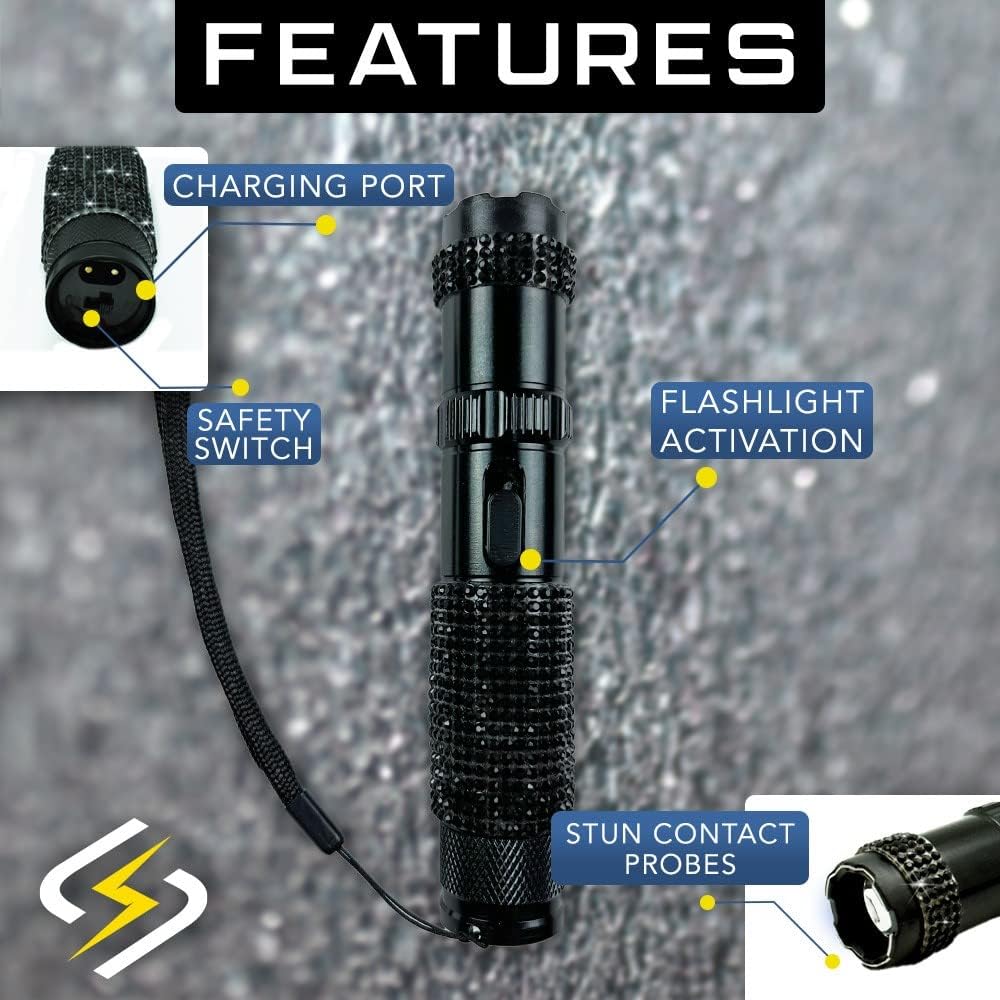⚡ POWERFUL STUN, UNIQUE DESIGN: The Jolt RhineStun is so powerful, the sound of electricity pulsing across the probes is often enough to scare off a threat, making it the perfect addition to any self defense kit. All personal safety devices for women need style too, which is why this cute stun gun has rhinestones around the handle.
