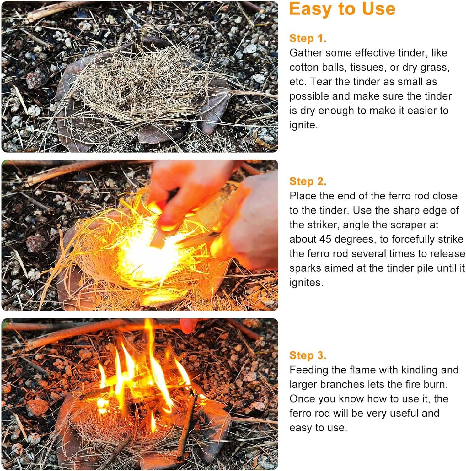 【How to use】Before first use, you need to scrape away the coating of the ferro rod to expose shiny metal. Then you can follow the steps to easily ignite a fire with the ferro rod.