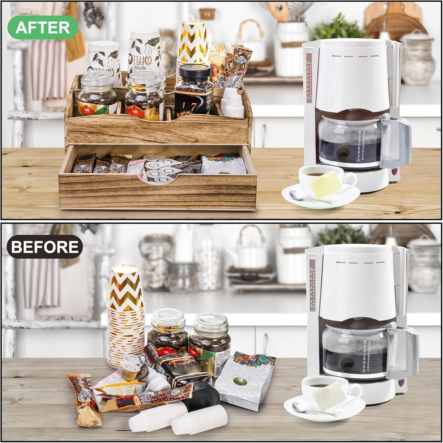 Larger Capacity: Our countertop coffee station is good for organizing coffee accessories. Strategically designed with 7 compartments for tea bag, sugar, sticks, straws, and paper cups, the extra drawer can store coffee pods or other coffee accessories