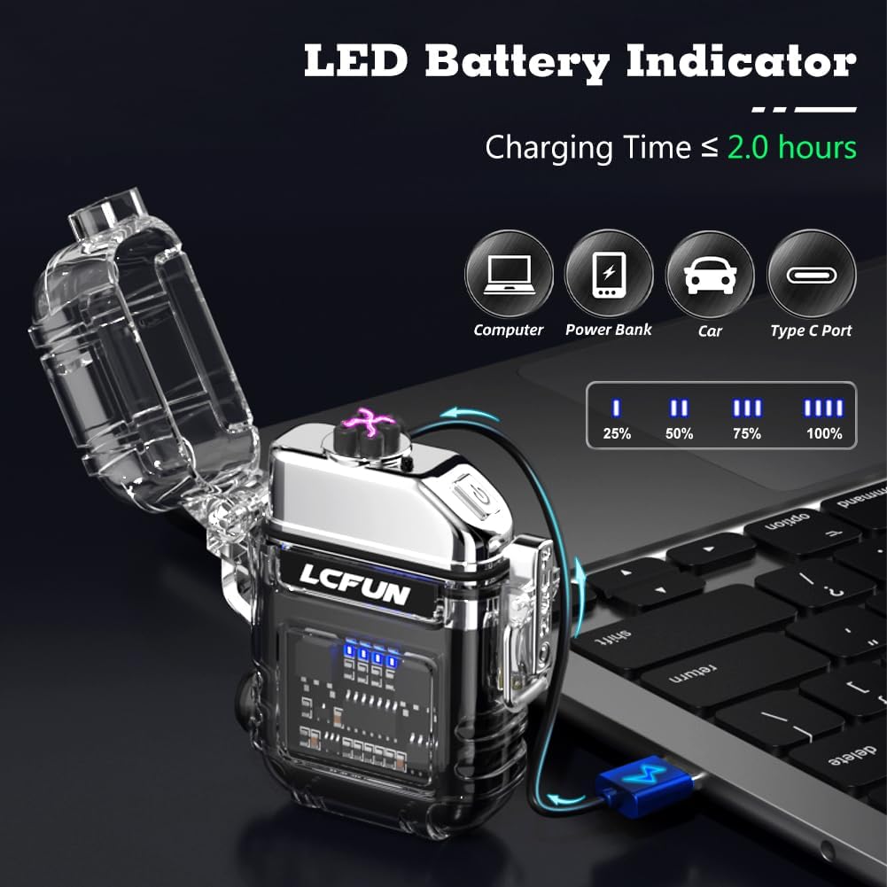 Battery Notification & Cool Strip Light: Upgraded LcFun survival lighter can display battery power in real time. The indicator light will flash when charging, when 4 Led lights all turn on, it is fully charged. The side of the lighter has a led strip light, and the three color transformations