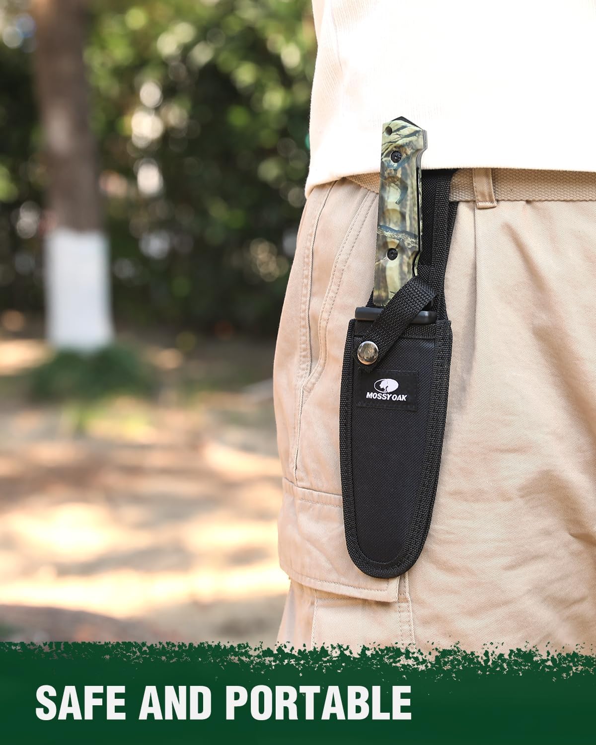 Black Heavy Duty Sheath: The nylon dual-carry black sheath for the MOSSY OAK Knife Set provides easy and secure carry, keeping everything at your fingertips when needed. It features a button snap and belt loop for safe and convenient carrying