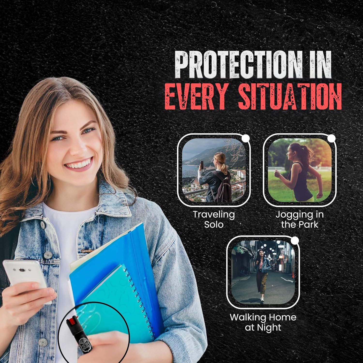 Built-In Key chain – Tough & durable for everyday carry protection in a compact black can. Ideal for women and men to carry on their keys or in their bags to have security with you anywhere you go and a glow in the dark version to quickly see where to press and fire at night to save precious seconds to defend yourself.