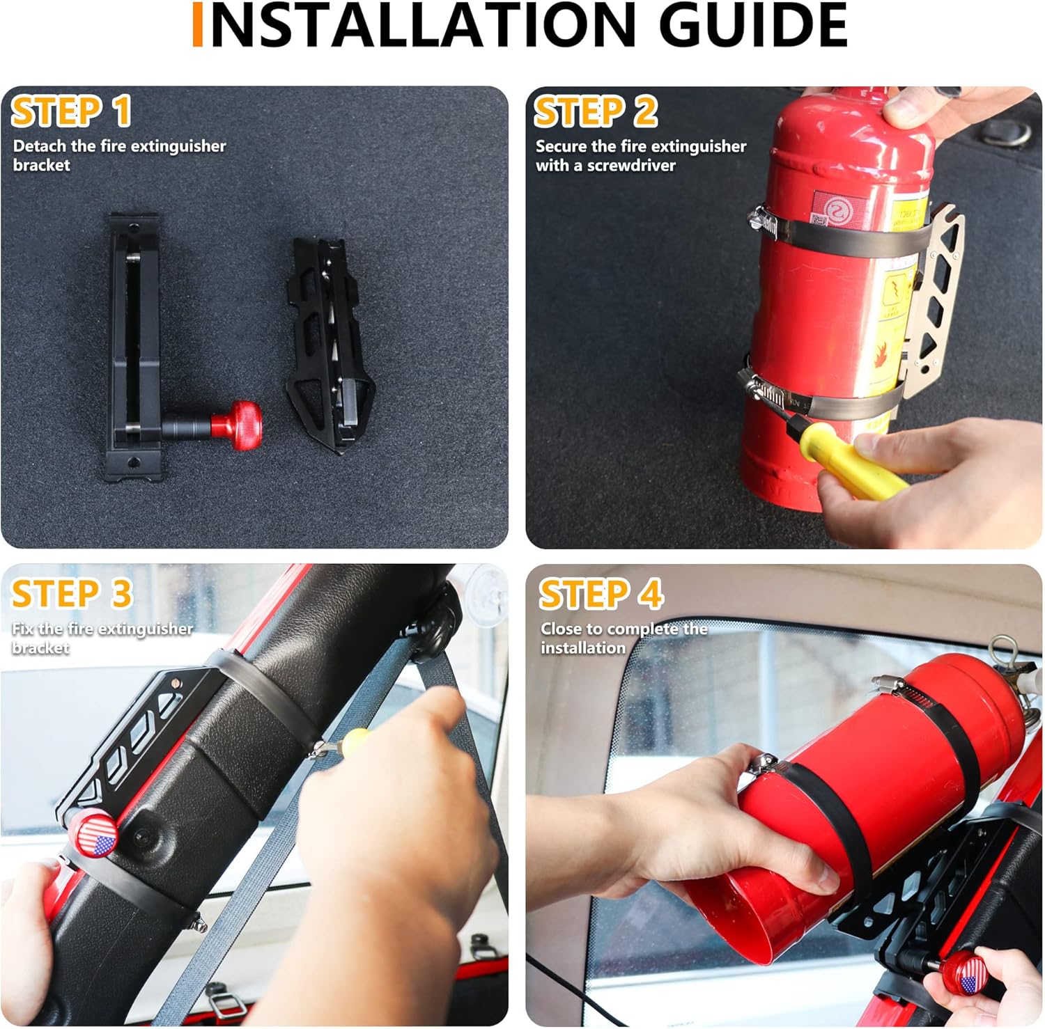 Quick release by pulling the America Flag red knob when you need it, safer and more effective. Also, quick installation back the fire extinguisher, faster and more convenient.