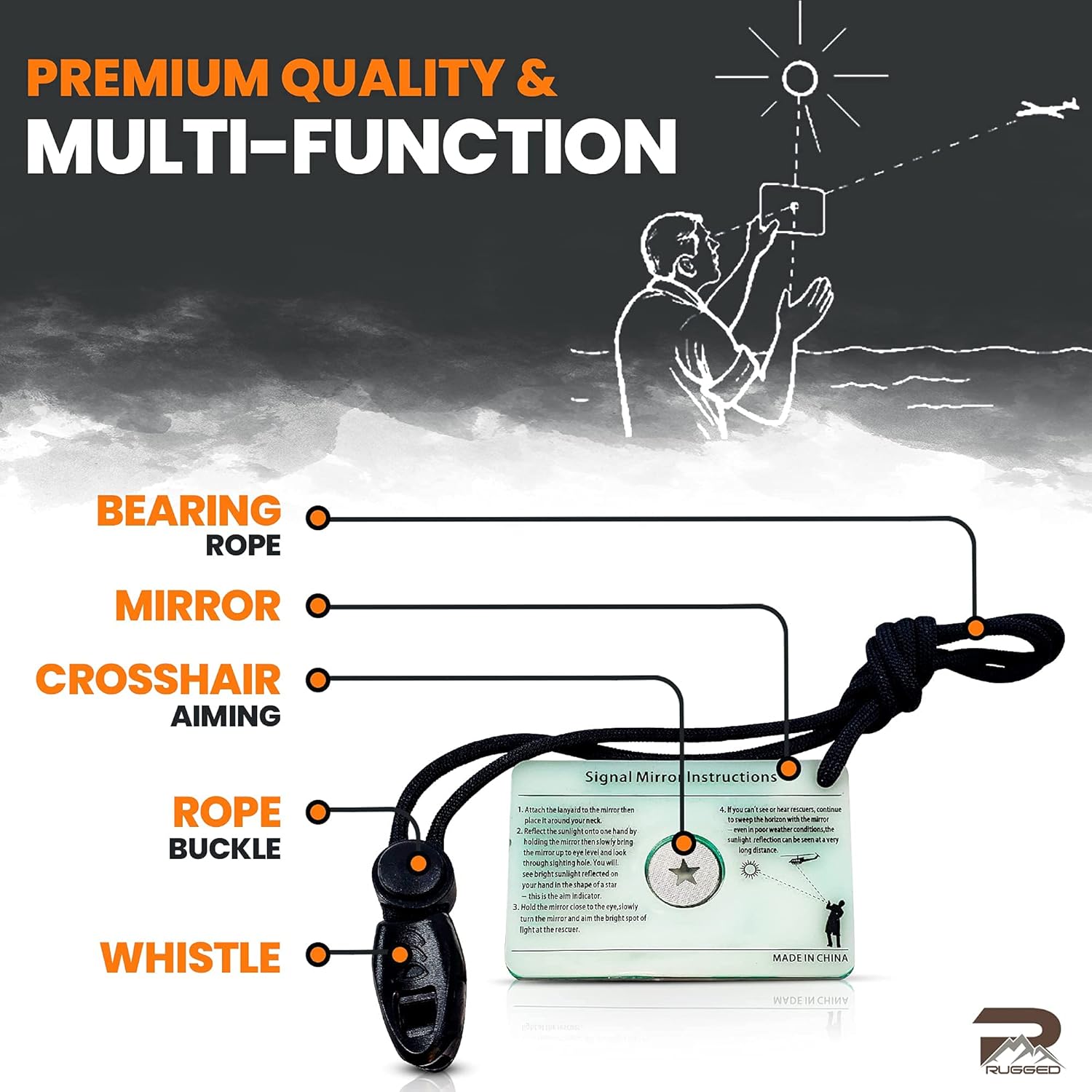 🆘 SUPERB VALUE FOR MONEY – The kit is made to serve many functions. The mirror comes with a bearing rope, crosshair aiming, and rope buckle, while the flint has a paracord and a scraper striker.
