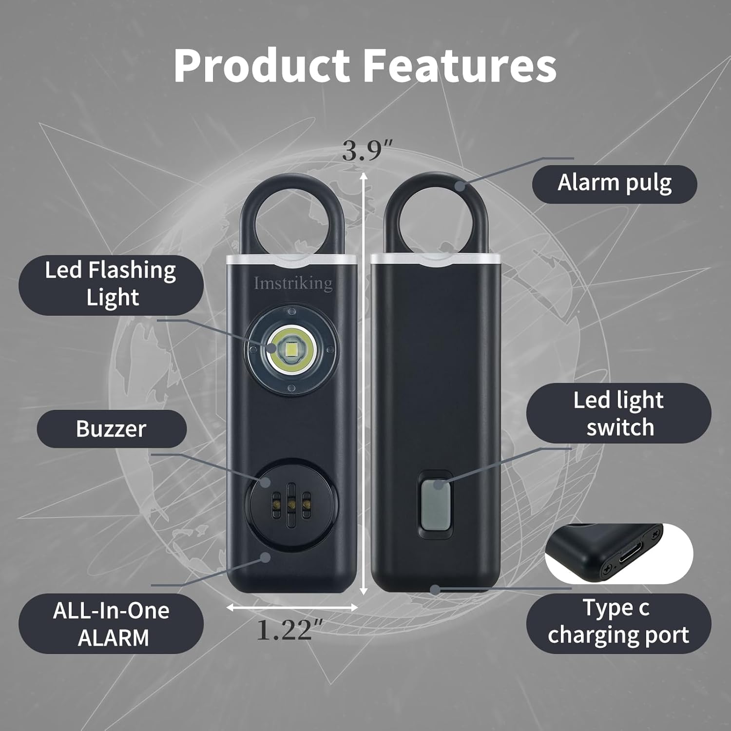 Rechargeable design: Low power alarm notice, Personal alarm clock can be charged,No hassle of changing batteries,Dual Use as a Regular Hand-held Flashlights as well. Integrated design structure durable: Personal alarm is more Stronger and resistant to fall. Safety Siren is a self-defense essential When you run outdoors, travel, hike, camp and walk your dog.Each personal alarm is hand-tested.