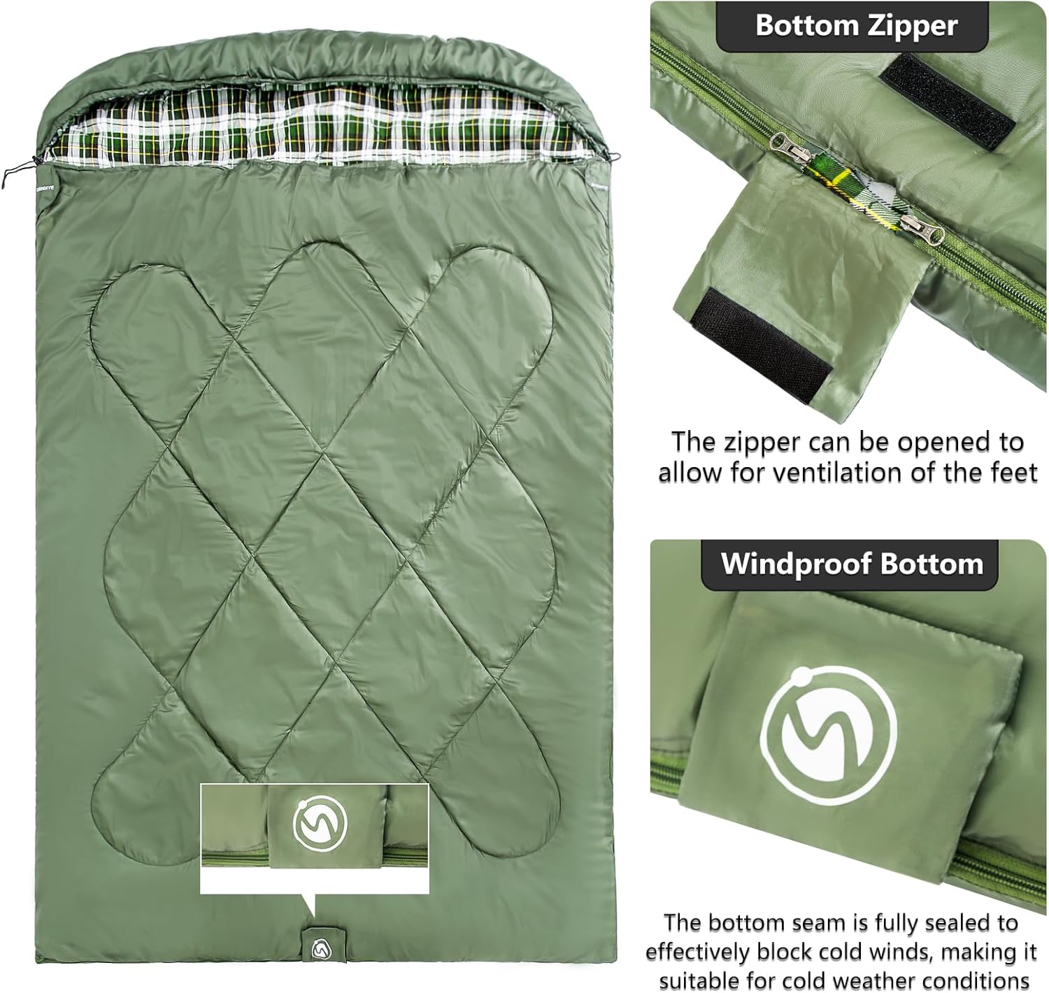 NEWEST Bottom Windproof Design: Unlike ordinary double sleeping bags, which have a small hole in the middle of the bottom, ShinHye double sleeping bags are specially designed with a small tail Velcro, which can be perfectly blocked for better temperature locking; you can also unzip the bottom zipper normally to release your feet in warm weather (see picture 2 for details).
