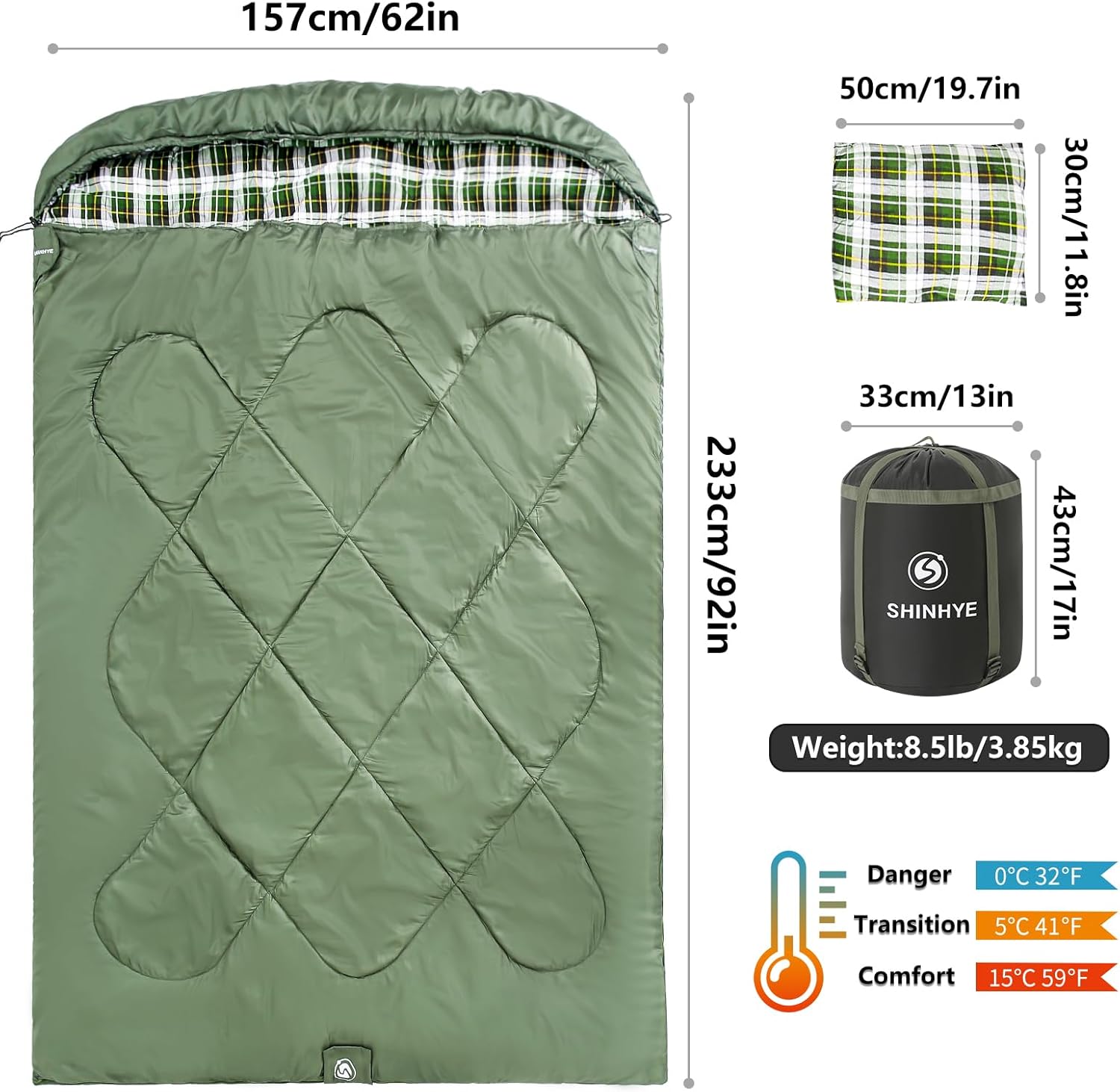 King&Queen Size: ShinHye extra large double sleeping bag with a spacious 92 x 62 inches (233 x 157 cm) size, larger than a queen-sized mattress and can be compresses down to 17x 13inches package.