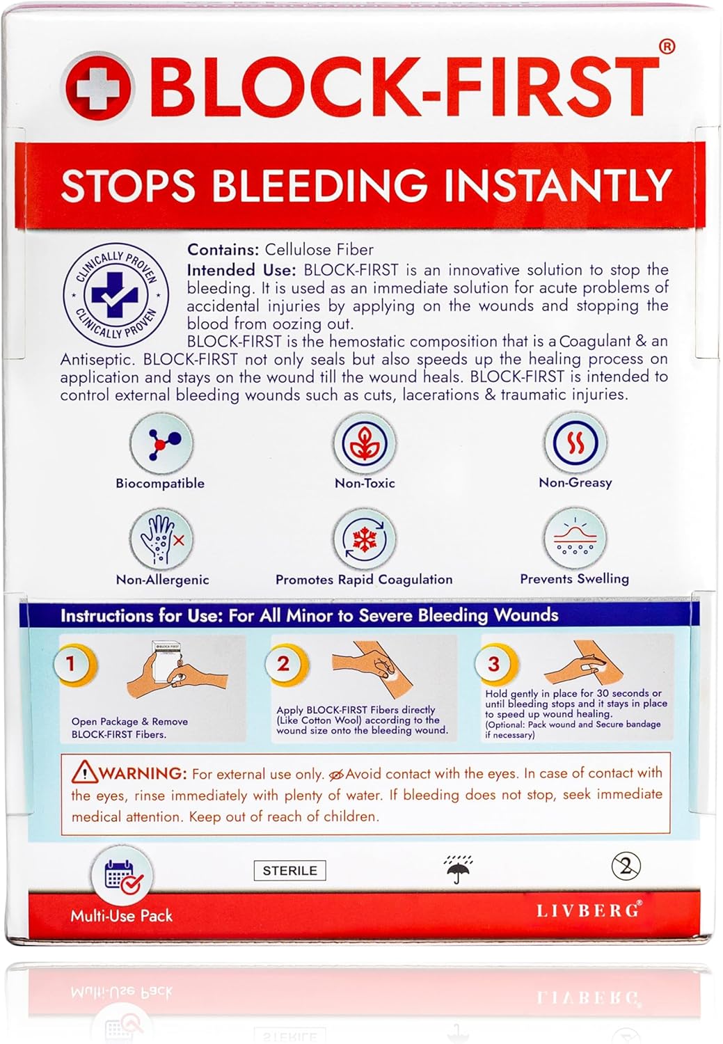BLOCK-FIRST is Quick, Safe, and Easy to Use. Just Apply Direct onto the Bleeding Wound and Stops bleeding instantly. No Bandage, Gauze, or Solution is Required.