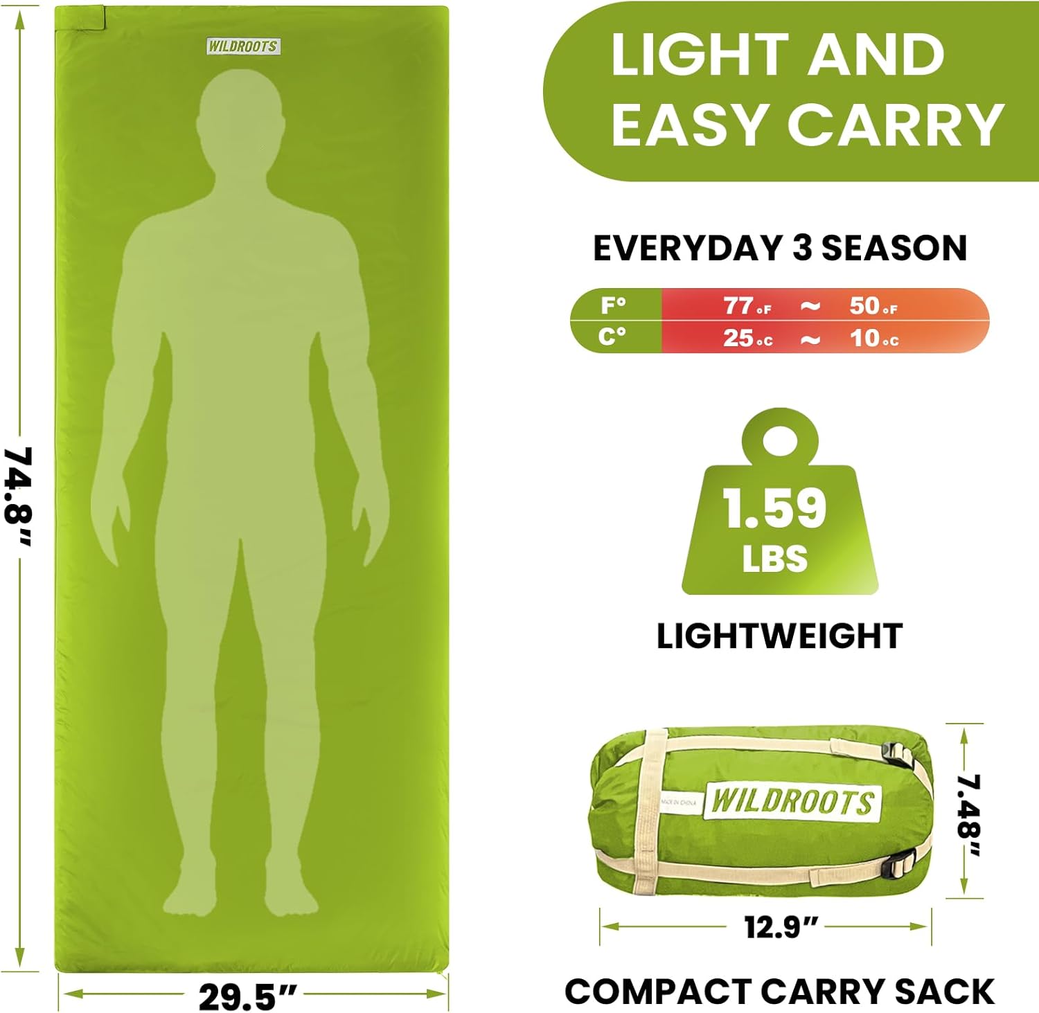 Lightweight and portable: This sleeping bag weighs only 1.59lbs, with an unfolded size of 74.8″x29.5″. It can be easily put into the equipped Oxford compression bag, which has a size of 12.9″x7.48″, The folded volume is small, which is convenient for storage, carrying and travel use